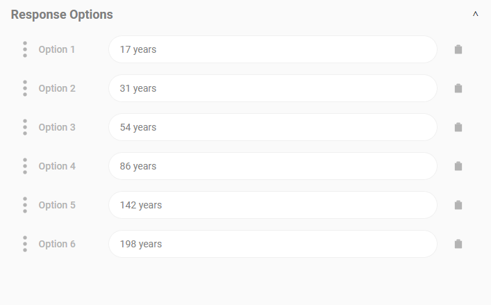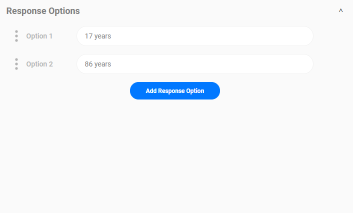 Multiple Choice and Multiple Select questions have a minimum of 2 and a maximum of 6 Response Options.